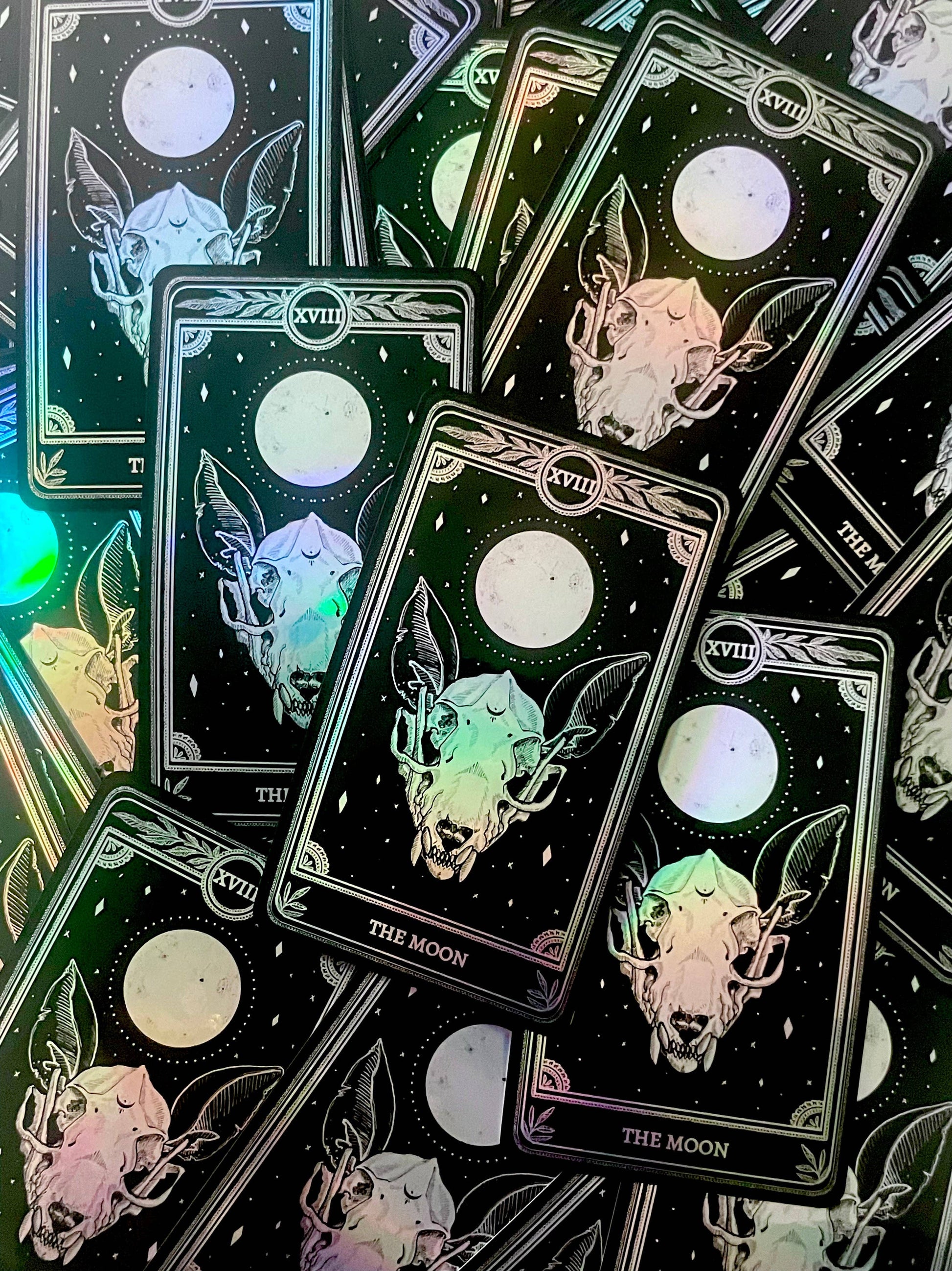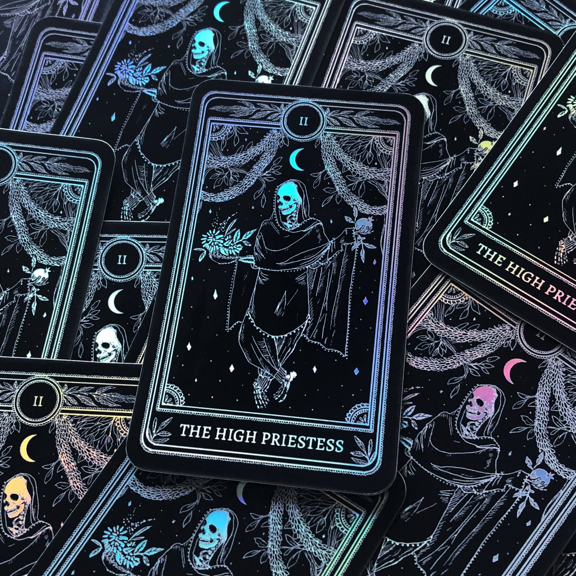 "The Star", "The Moon", "The Sun", "The World", "Strength", "The Lovers", "Death", The Devil", "The High Priestess", from The Marigold Tarot - watch them shift colors under the light!