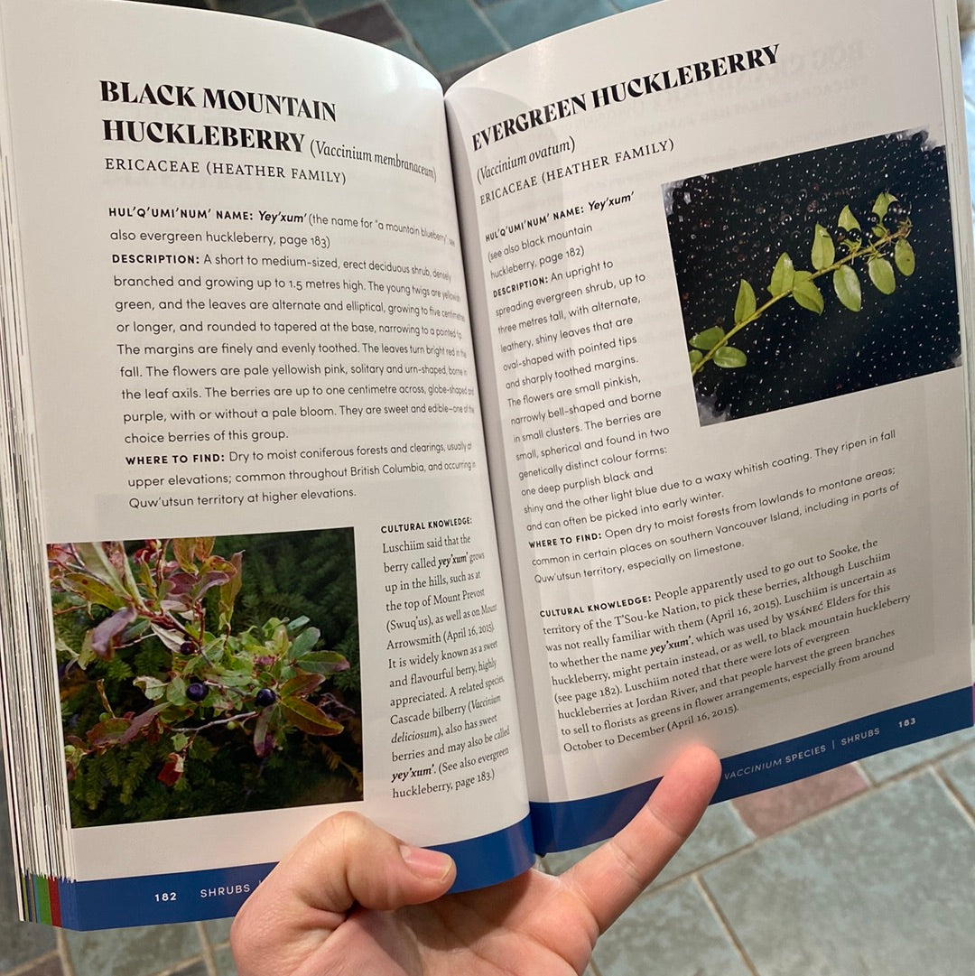In this unprecedented collection of botanical information, over 140 plants are categorized within their broad botanical groupings: algae and seaweeds, lichens, fungi and mushrooms, mosses and liverworts, ferns and fern-allies, coniferous trees, deciduous trees, shrubs and vines, and herbaceous flowering plants. Each entry is illustrated with a colour photo and includes the plant’s common, scientific and Hul′q′umi′num′ names; a short description; where to find it; and cultural knowledge related to the plant. Additional notes encompass plant use, safety and conservation; the linguistic writing system used for Hul′q′umi′num′ plant names; as well as miscellaneous notes from interviews with Luschiim.