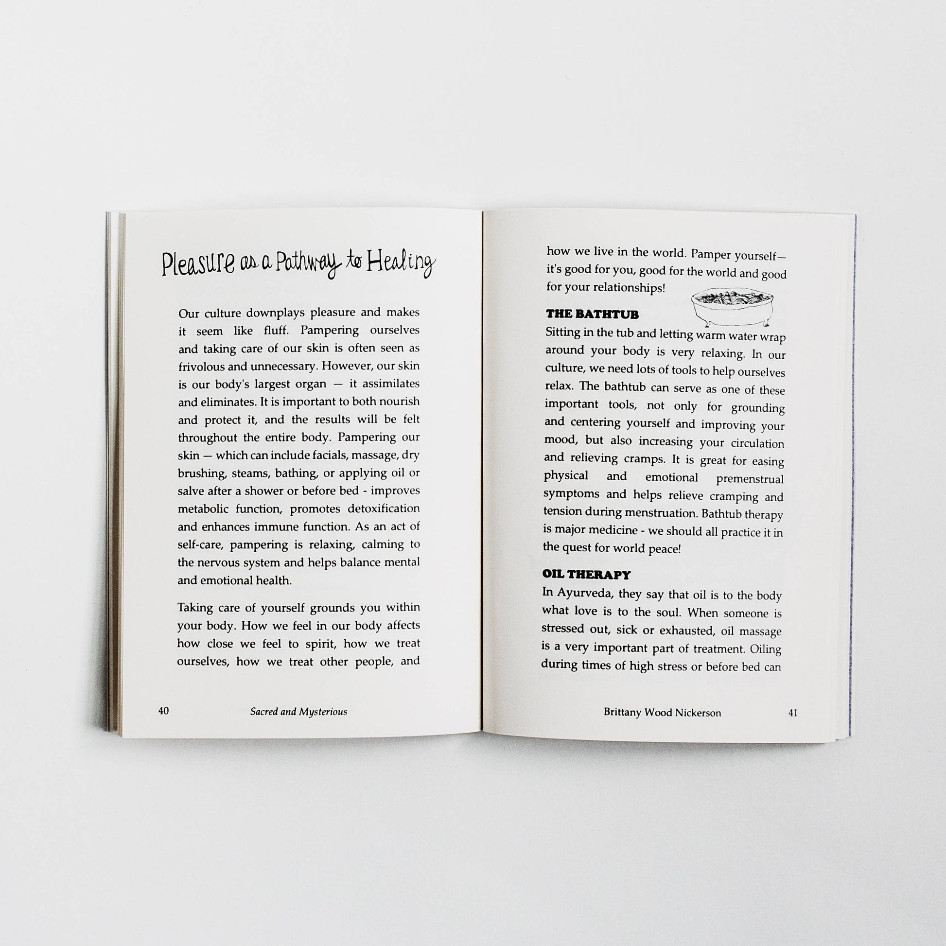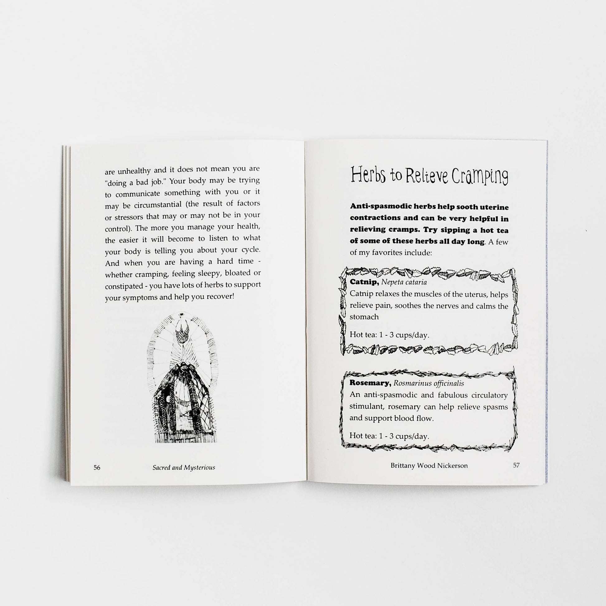 Sacred and Mysterious includes dietary, herbal, and lifestyle information to help support and care for the body throughout each phase of menstruation. It includes information on nourishing and strengthening the body as well as advice for supporting symptoms of menstruation and pre-menstruation.