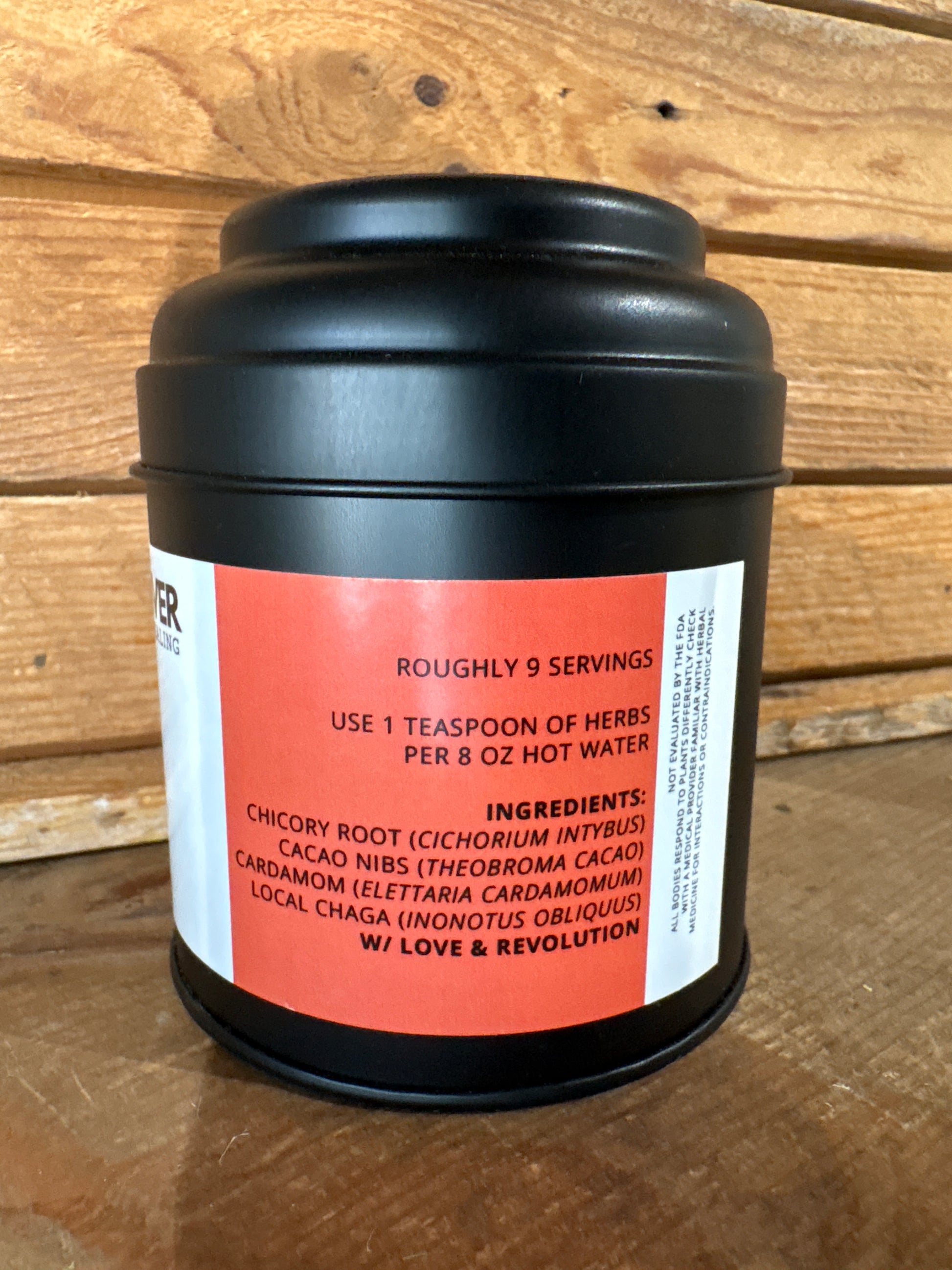 Made with locally wildcrafted chaga mushroom, Organic chicory root, organic cacao, organic cardamom, w/ love & revolution