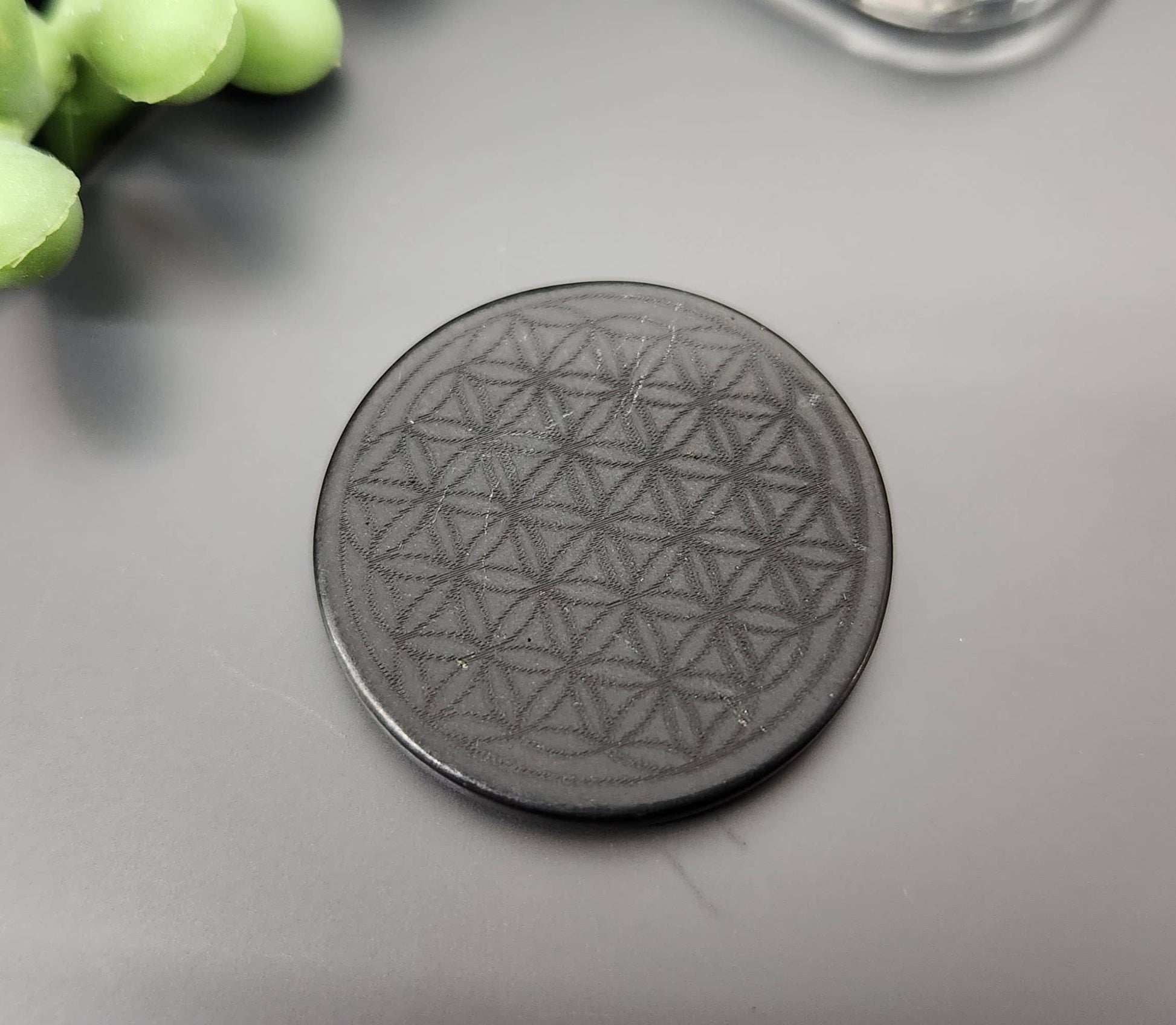 Helpful Shungite cell phone tile for EMF protection. It is engraved with the Flower of Life. There is a sticky adhesive on the back side of the tile so you can apply it to your phone cover.