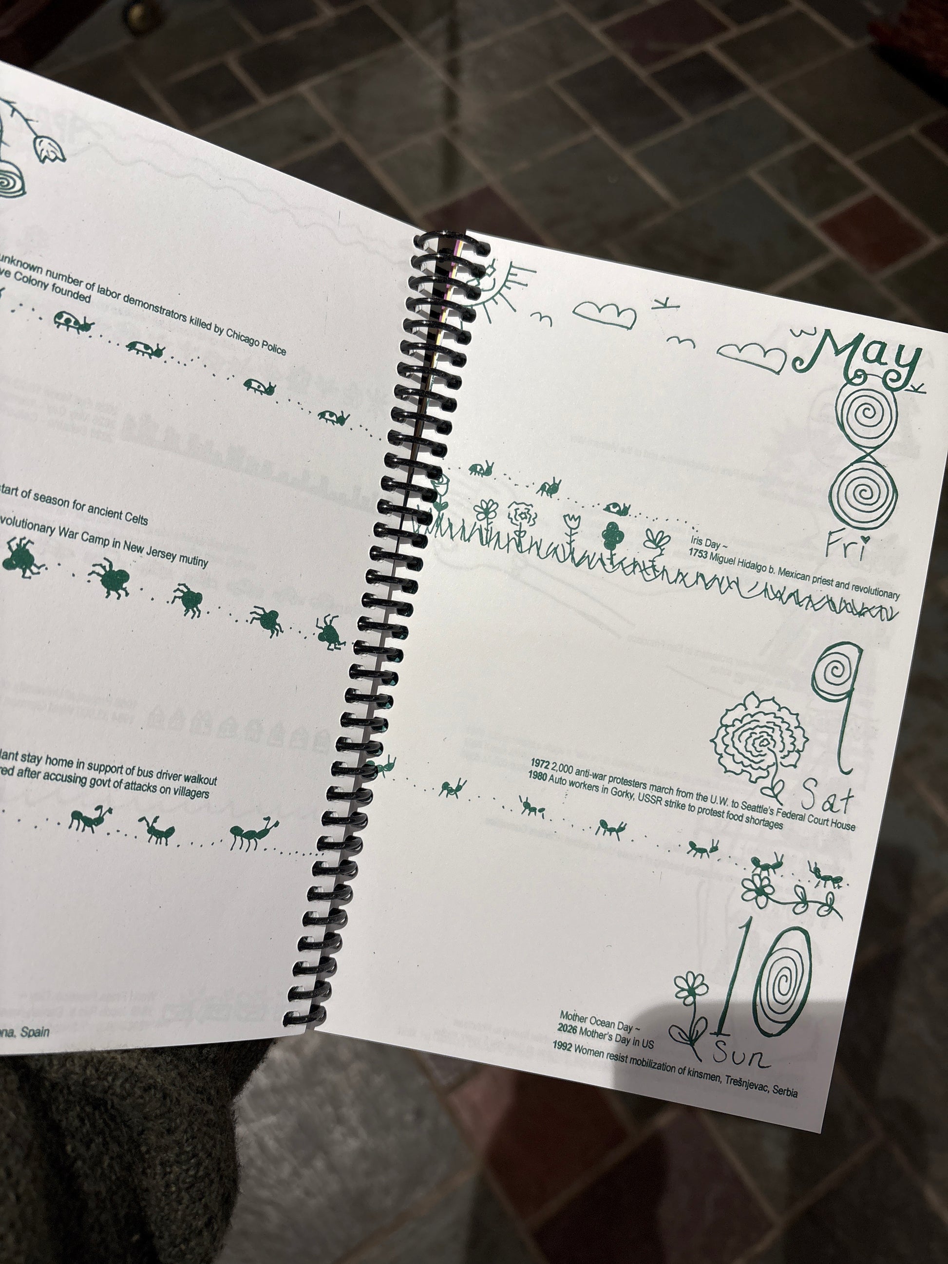 Pocket: The pocket version “classic” is a 176 page pocket planner (4.25 inches X 5.5 inches) with radical dates for every day of the year, space to write your phone numbers, a contact list of radical groups around the globe, menstrual calendar, info on police repression, extra note pages, plus much more. It has a tough layflat binding and a laminated cover for durability.