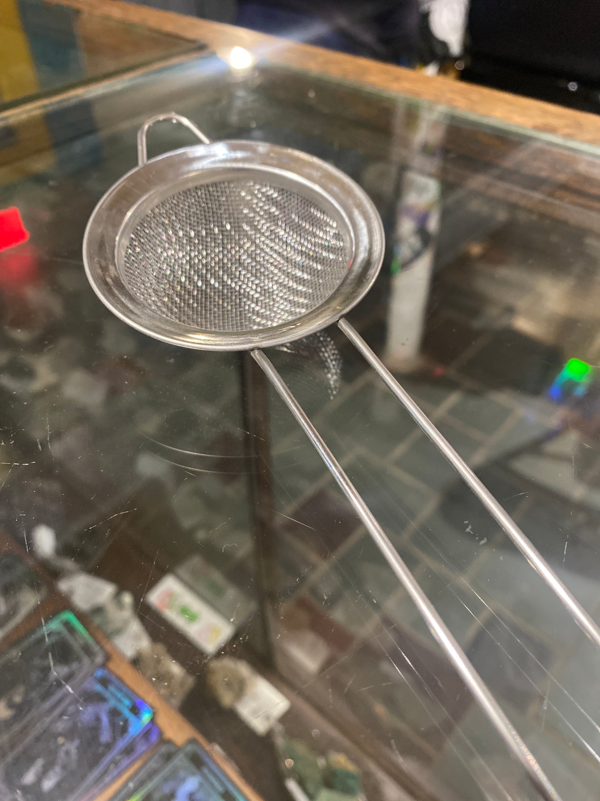 This fine mesh stainless steel strainer is used to filter out loose tea leaves as the tea is poured through it.