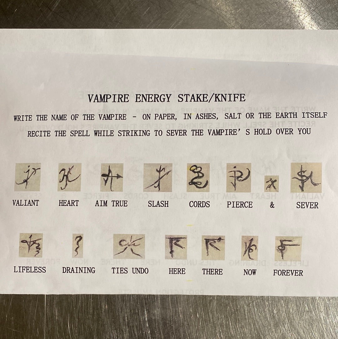 Write their name on paper, in ashes, in salt, or in the earth. Recite the spell by deciphering the sigils with the information in the picture. As you recite the spell, strike the stake/knife and you will sever the vampire's hold over you.