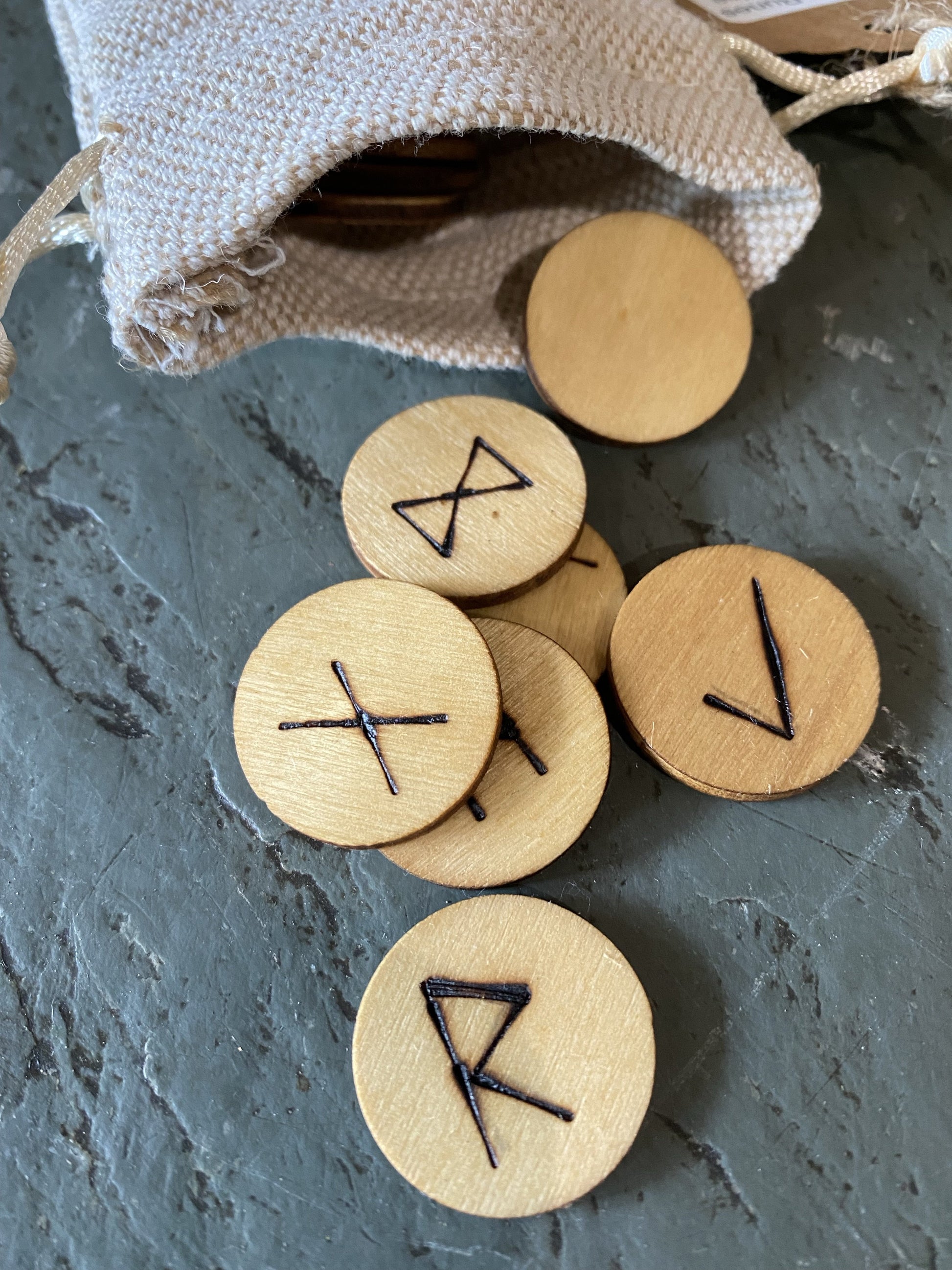 These runes are woodburned by justin and each set is individually stained using natural handmade stains of beet, turmeric, coffee, or elderberry.
